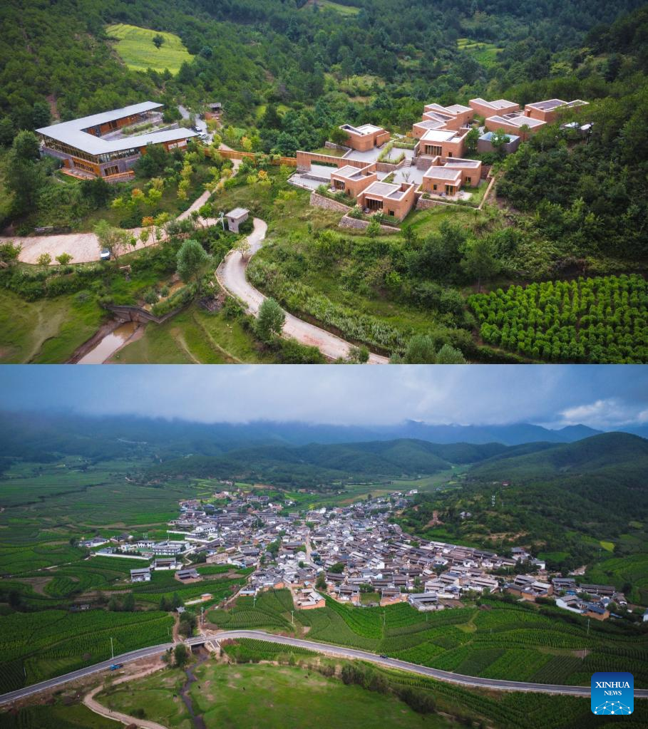 Combo photo shows aerial view of the Linden Center in Shilong Village of Shaxi Town (top), and bird's view of Shilong Village, in southwest China's Yunnan Province on Aug. 31, 2022. (Xinhua/Cao Mengyao)