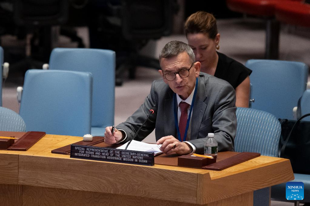 Volker Perthes (Front), the UN secretary-general's special representative and head of the UN Integrated Transition Assistance Mission in Sudan, speaks at a Security Council meeting on Sudan at the UN headquarters in New York, on Sept. 13, 2022. The top UN envoy for Sudan on Tuesday saw an opportunity to help end the political crisis in Sudan. (Cia Pak/UN Photo/Handout via Xinhua)