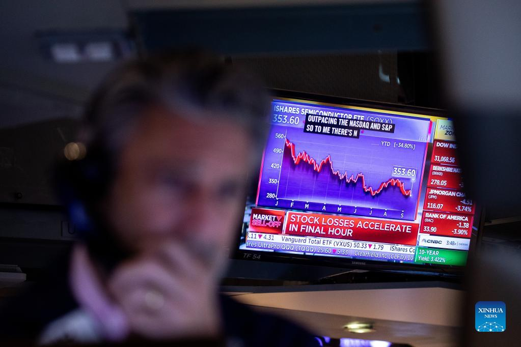 A trader works at the New York Stock Exchange (NYSE) in New York, the United States, Sept. 13, 2022. Wall Street's three major averages plummeted on Tuesday as a hotter-than-expected U.S. inflation report stoked fears that the Federal Reserve is likely to deliver more outsized rate hikes. The Dow Jones Industrial Average tumbled 1,276.37 points, or 3.94 percent, to 31,104.97. The S&P 500 dropped 177.72 points, or 4.32 percent, to 3,932.69. The Nasdaq Composite Index shed 632.84 points, or 5.16 percent, to 11,633.57. (Photo by Michael Nagle/Xinhua)