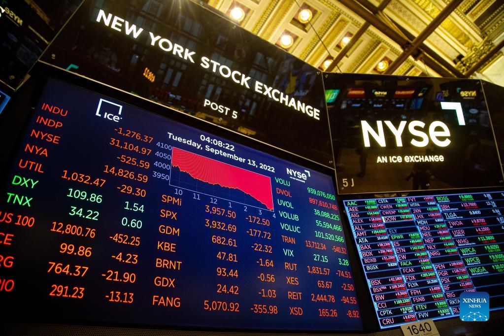 NEW YORK, Sept. 13 (Xinhua) -- Wall Street's three major averages plummeted on Tuesday as a hotter-than-expected U.S. inflation report stoked fears that the Federal Reserve is likely to deliver more outsized rate hikes.
