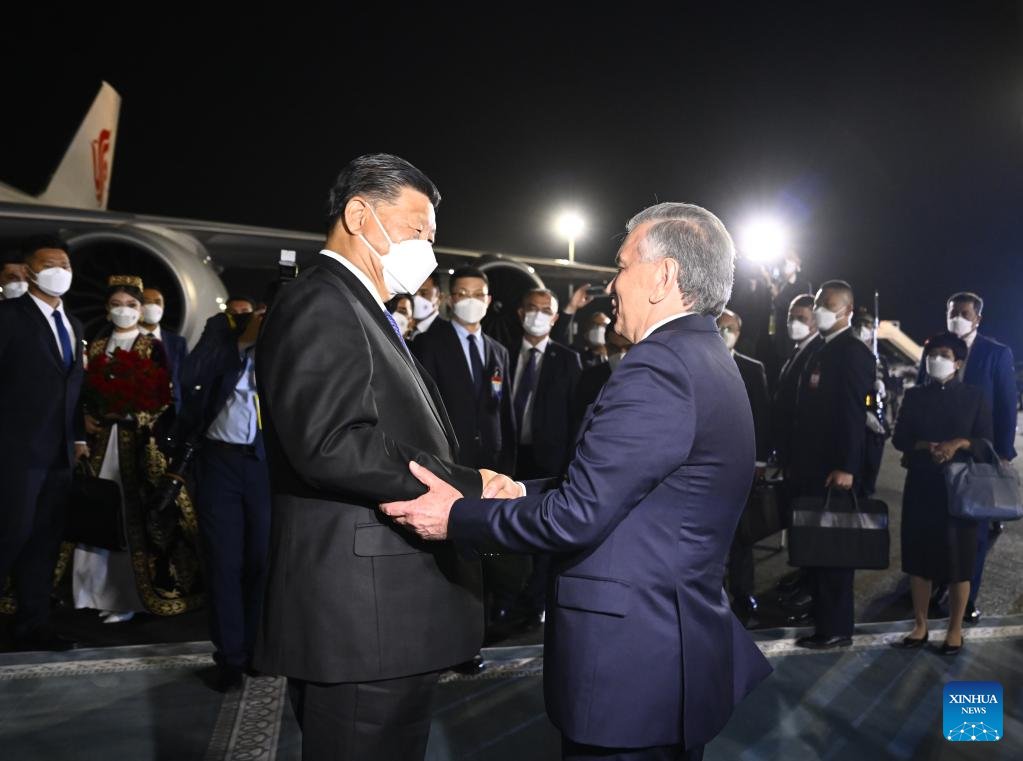 Chinese President Xi Jinping arrives in Samarkand to pay a state visit to Uzbekistan and attend the 22nd meeting of the Council of Heads of State of the Shanghai Cooperation Organization (SCO), Sept. 14, 2022. At the airport, Xi was warmly greeted by Uzbek President Shavkat Mirziyoyev, Prime Minister Abdulla Aripov, Foreign Minister Vladimir Norov, Governor of Samarkand region Erkinjon Turdimov and other high-level officials. (Xinhua/Li Xueren)