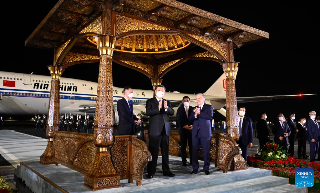 Chinese President Xi Jinping arrives in Samarkand to pay a state visit to Uzbekistan and attend the 22nd meeting of the Council of Heads of State of the Shanghai Cooperation Organization (SCO), Sept. 14, 2022. At the airport, Xi was warmly greeted by Uzbek President Shavkat Mirziyoyev, Prime Minister Abdulla Aripov, Foreign Minister Vladimir Norov, Governor of Samarkand region Erkinjon Turdimov and other high-level officials. (Xinhua/Li Xueren)