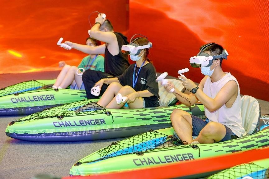 People join a virtual rowing game in an e-sports experience hall in Fuzhou, southeast China's Fujian province, July 18, 2022. (People's Daily Online/Xie Guiming)