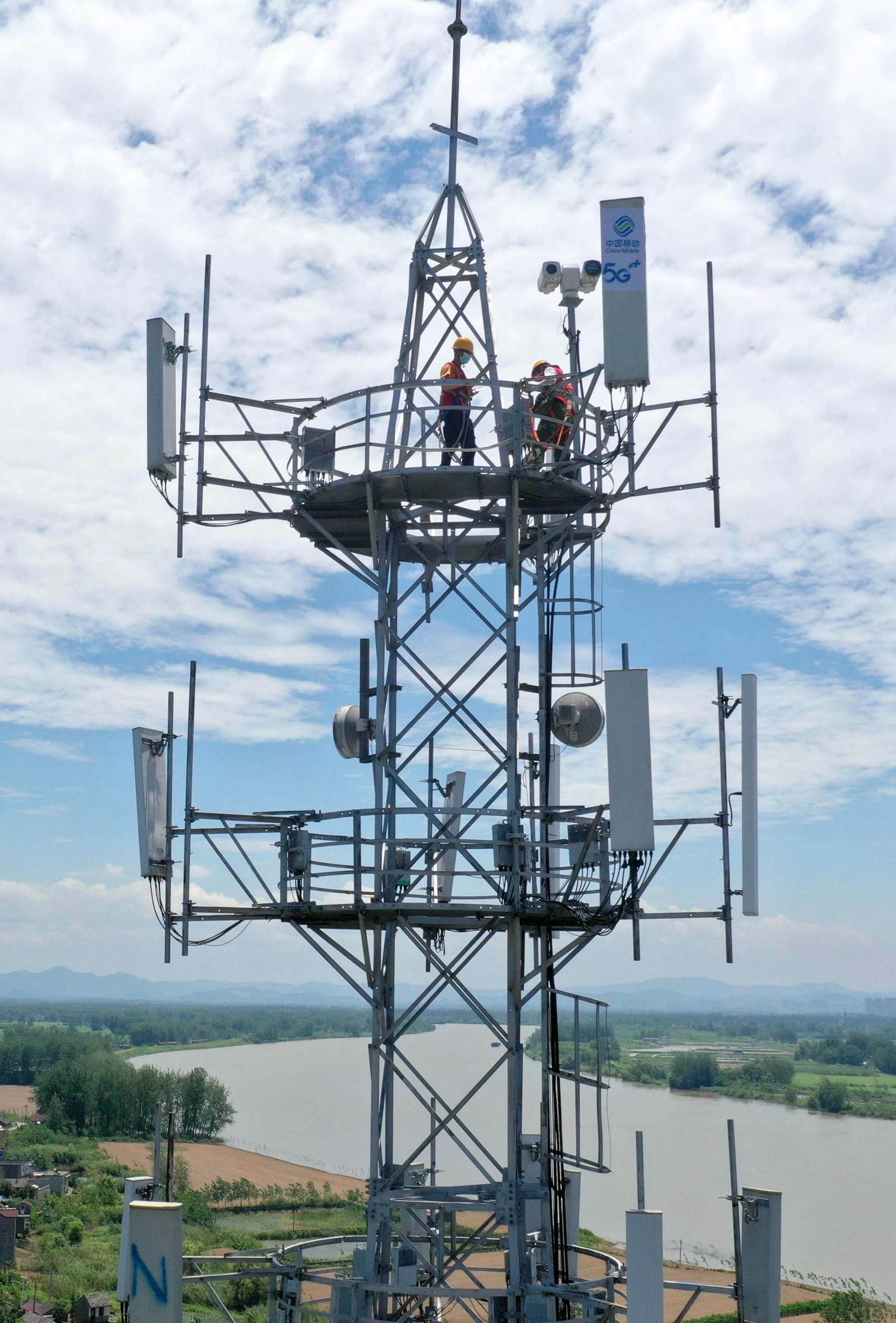 Photo taken on July 8, 2022 shows workers adjusting antenna at a 5G base station in Xuba township, Tongling, east China's Anhui province. (People's Daily Online/Guo Shining)
