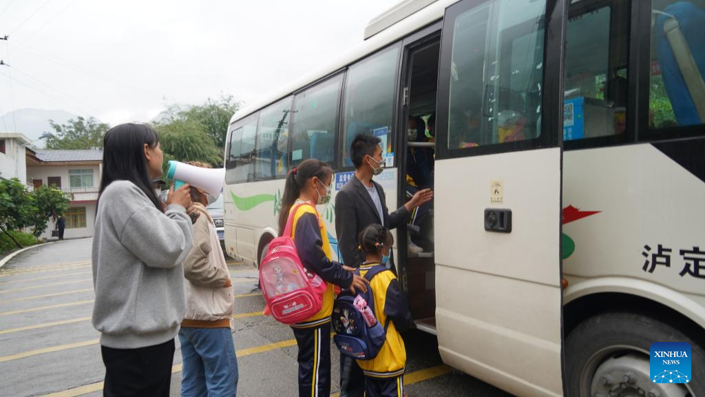 Students take a bus heading for a boarding school in Luding County, southwest China's Sichuan Province, Sept. 14, 2022. Classes have been resumed in Luding County and neighboring areas in an orderly way after a 6.8-magnitude earthquake happened on Sept. 5. (Xinhua/Yin Heng)
