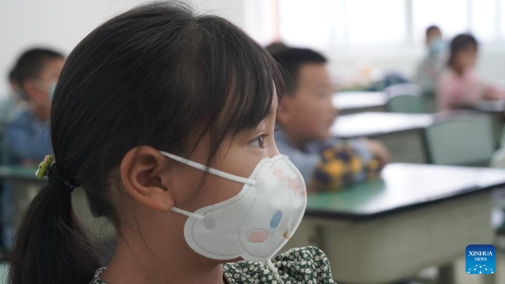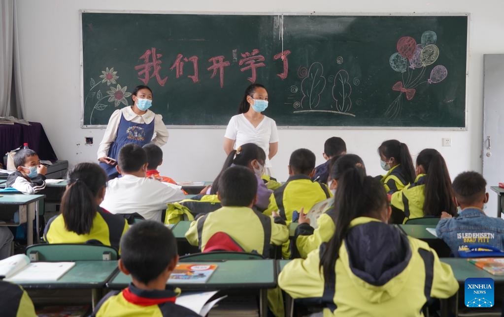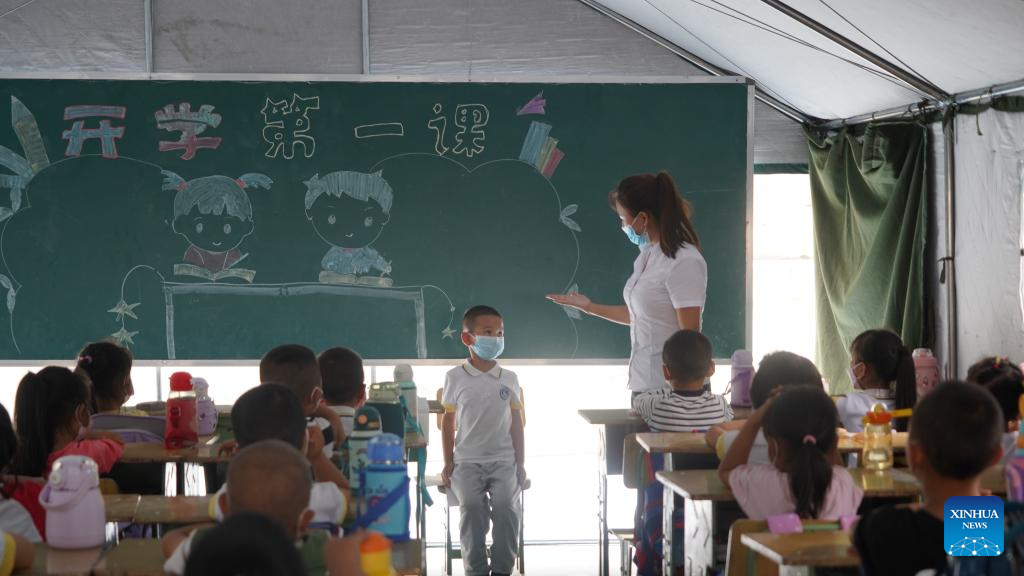 Students have class at a primary school in Luding County, southwest China's Sichuan Province, Sept. 14, 2022. Classes have been resumed in Luding County and neighboring areas in an orderly way after a 6.8-magnitude earthquake happened on Sept. 5. (Xinhua/Yin Heng)