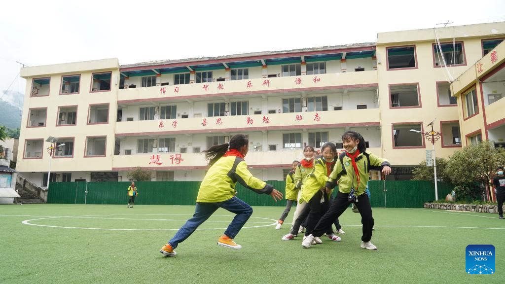 Students play games at a primary school in Luding County, southwest China's Sichuan Province, Sept. 14, 2022. Classes have been resumed in Luding County and neighboring areas in an orderly way after a 6.8-magnitude earthquake happened on Sept. 5. (Xinhua/Yin Heng)