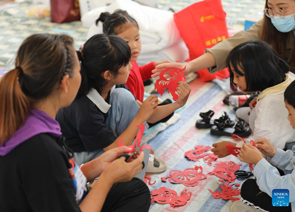 Students learn paper cutting at a temporary classroom in Shimian County, southwest China's Sichuan Province, Sept. 14, 2022. Classes have been resumed in Luding County and neighboring areas in an orderly way after a 6.8-magnitude earthquake happened on Sept. 5. (Xinhua/Liu Qiong)