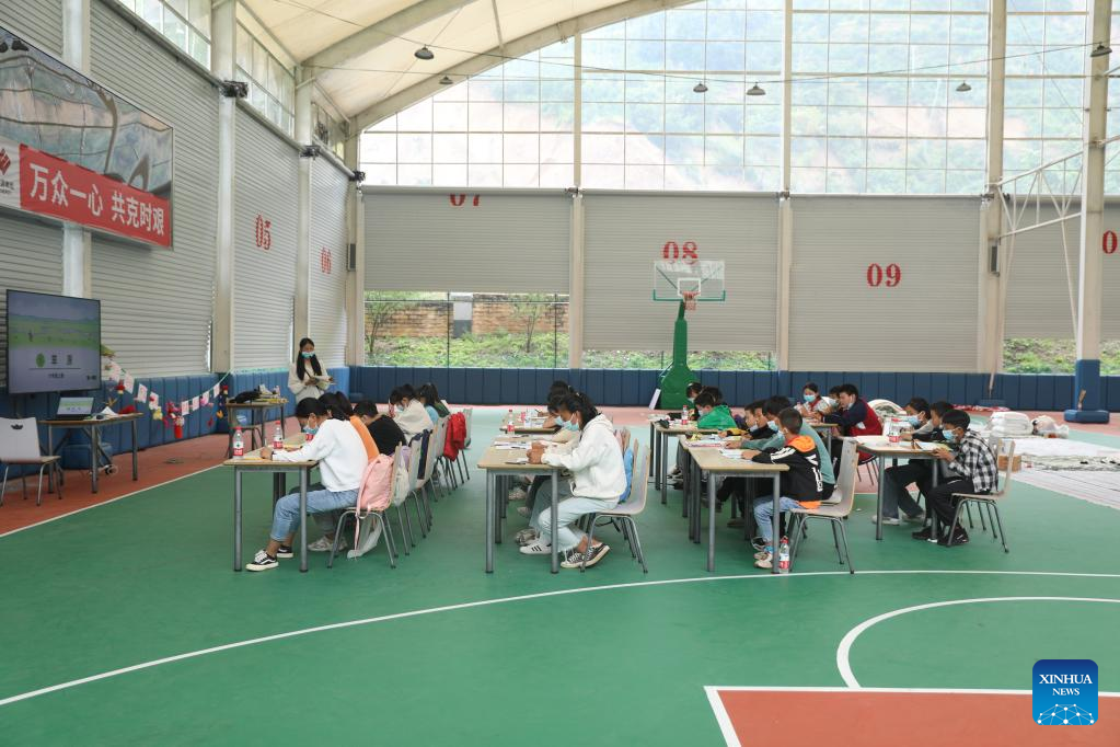 Students have class at a boarding school in Luding County, southwest China's Sichuan Province, Sept. 14, 2022. Classes have been resumed in Luding County and neighboring areas in an orderly way after a 6.8-magnitude earthquake happened on Sept. 5. (Xinhua/Yin Heng)