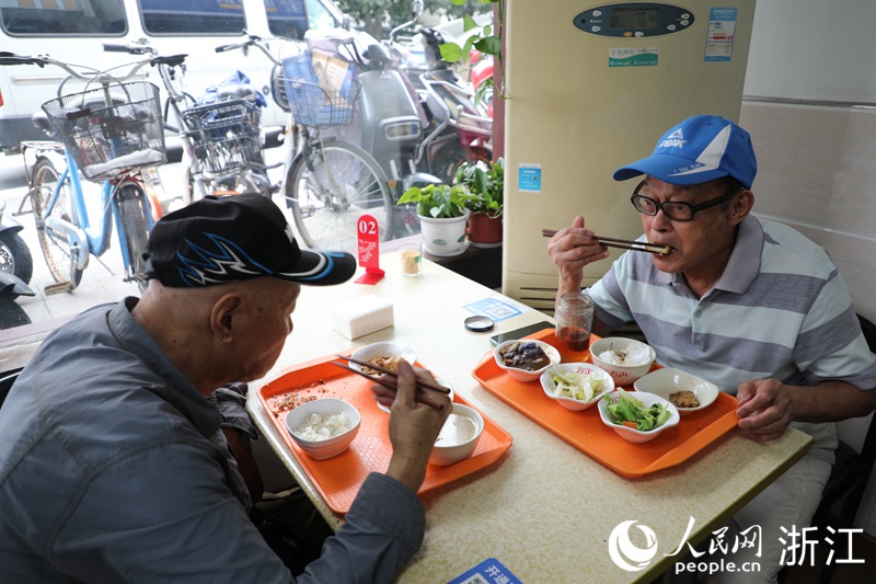 Wang Jintu and his friend eat at the canteen for elderly citizens in Lingyin neighborhood, Xihu district, Hangzhou city, east China's Zhejiang Province. (People's Daily Online/Fang Pengyimeng)