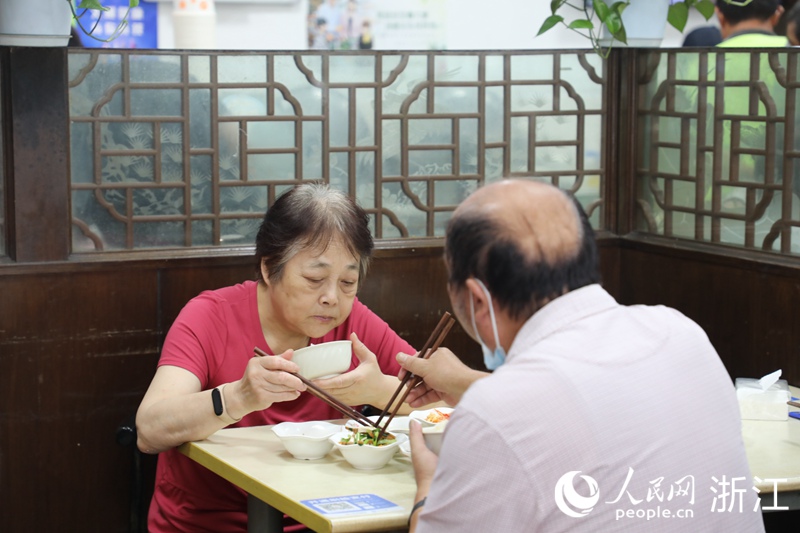 Elderly people dine inside the canteen located in Lingyin neighborhood, Xihu district, Hangzhou city, east China's Zhejiang Province. (People's Daily Online/Fang Pengyimeng)