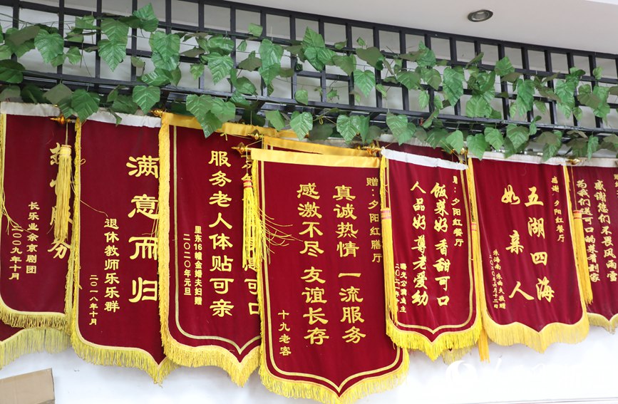 Photo shows the banners that some elderly customers presented to the canteen to express their grateful recognition of its considerate services. (People's Daily Online/Fang Pengyimeng)