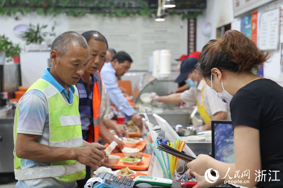 Non-elderly customers pay for meals inside the dining hall of the canteen located in Lingyin neighborhood, Xihu district, Hangzhou city, east China's Zhejiang Province. (People's Daily Online/Fang Pengyimeng)