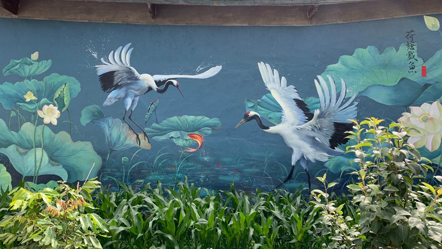 Photo shows a wall painting featuring cranes and lotus flowers. (Photo courtesy of the interviewee)