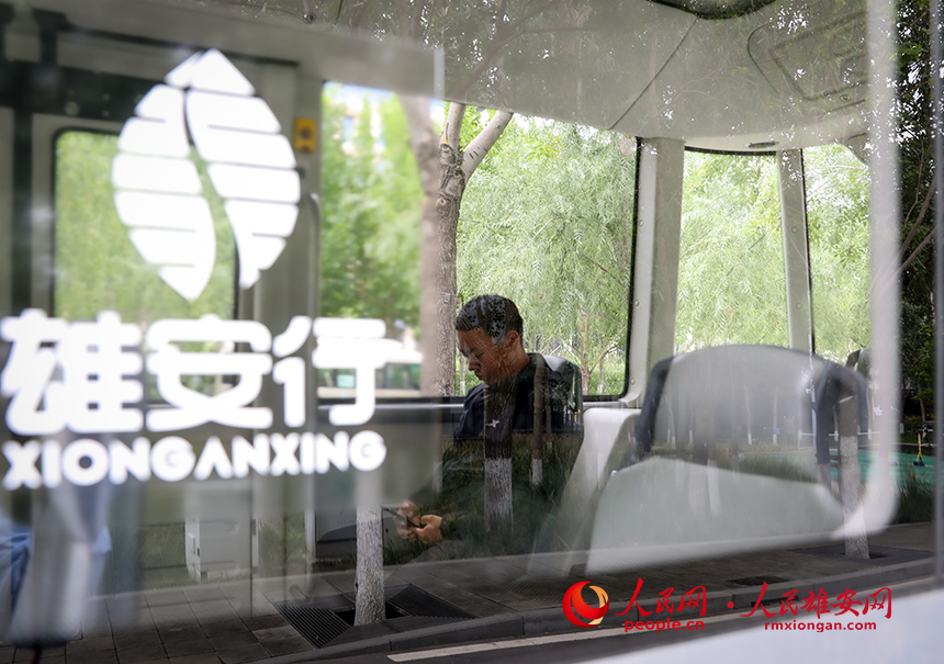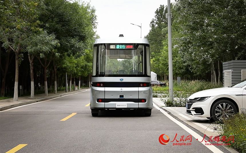 Photo shows a self-driving bus running on a road at the Xiongan citizen service center in Xiongan New Area, north China's Hebei Province. (People's Daily Online/Song Yewen)