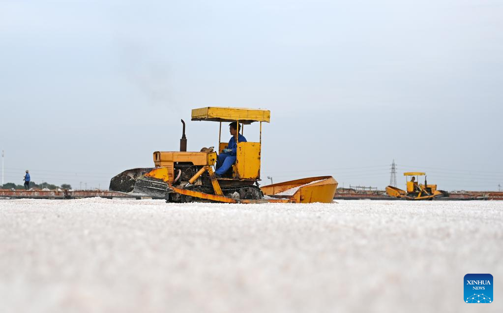 Machines work in a salt pond in the Changlu Hangu salt field, one of China's oldest coastal salt fields, in north China's Tianjin, Sept. 14, 2022.