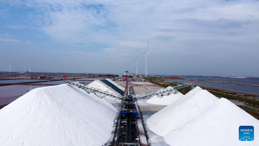 Aerial photo taken on Sept. 14, 2022 shows stacks of salt at the Changlu Hangu salt field, one of China's oldest coastal salt fields, in north China's Tianjin.