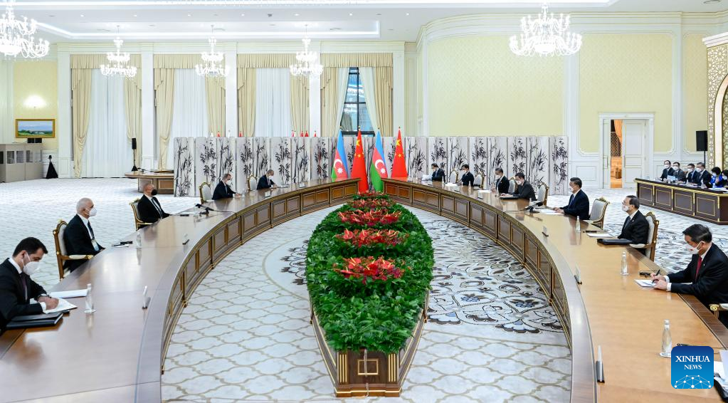 Chinese President Xi Jinping meets with Azerbaijani President Ilham Aliyev at Forumlar Majmuasi Complex in Samarkand, Uzbekistan, Sept. 15, 2022. (Xinhua/Zhai Jianlan)