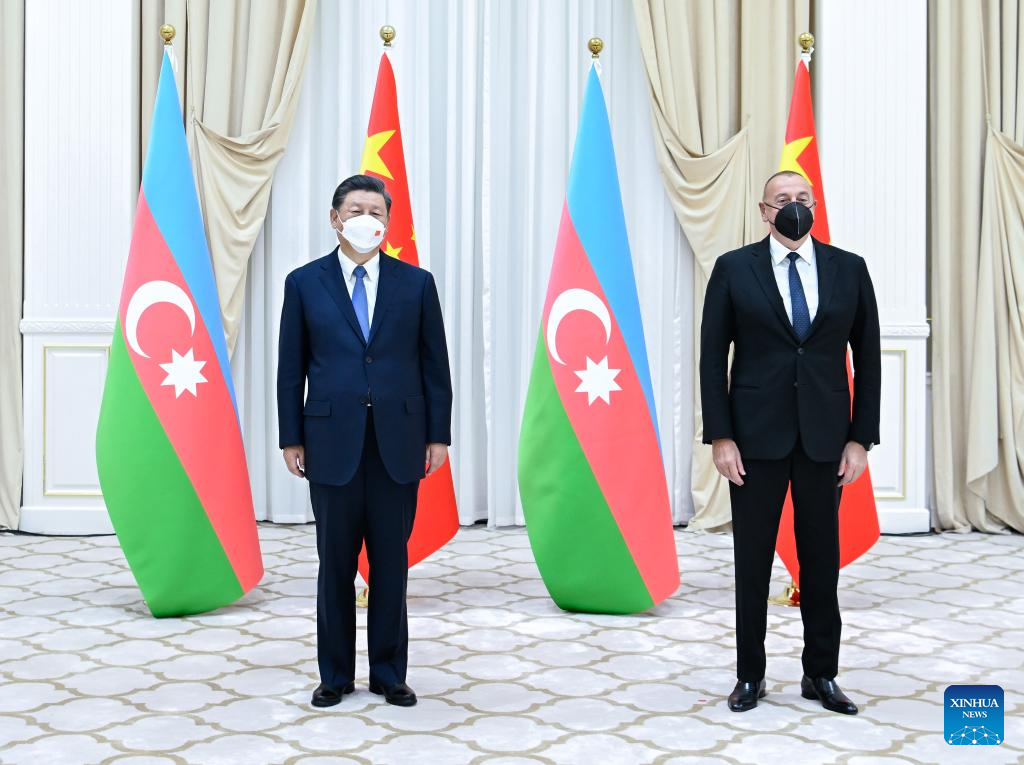 SAMARKAND, Uzbekistan, Sept. 15 (Xinhua) -- Chinese President Xi Jinping met with Azerbaijani President Ilham Aliyev on Thursday afternoon at Forumlar Majmuasi Complex in Samarkand.