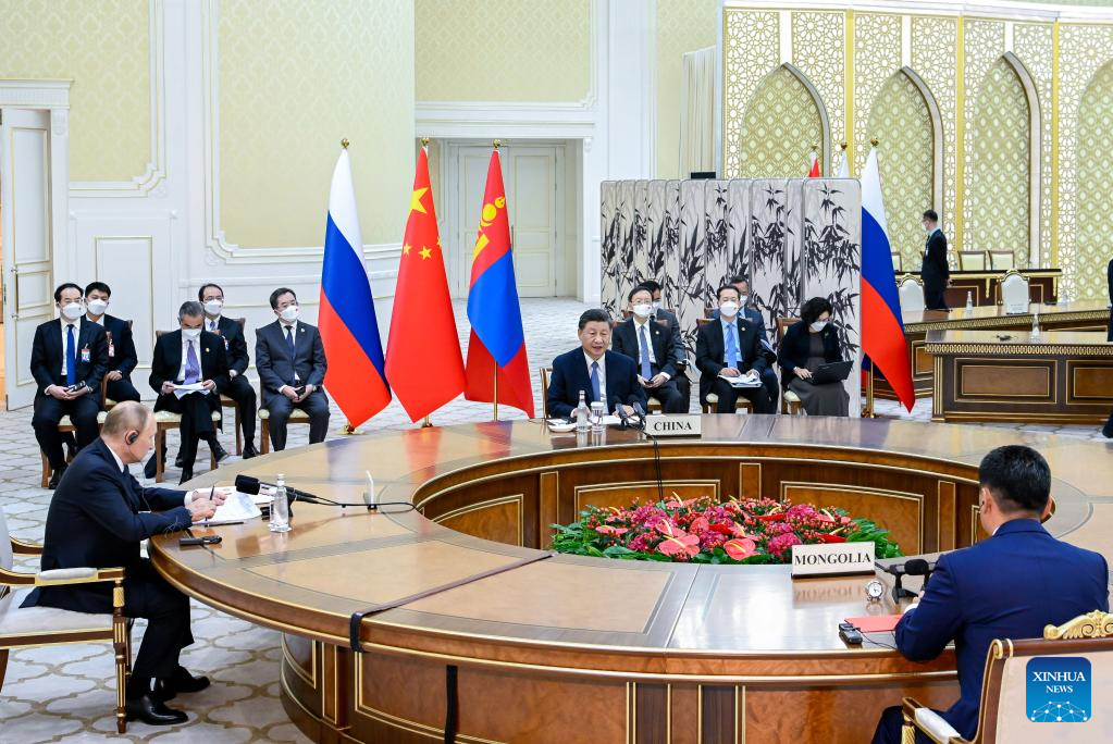 SAMARKAND, Uzbekistan, Sept. 15 (Xinhua) -- Chinese President Xi Jinping held the sixth meeting of heads of state of China, Russia and Mongolia with his Russian counterpart, Vladimir Putin, and Mongolian counterpart, Ukhnaa Khurelsukh, on Thursday afternoon at the Forumlar Majmuasi Complex in Samarkand.