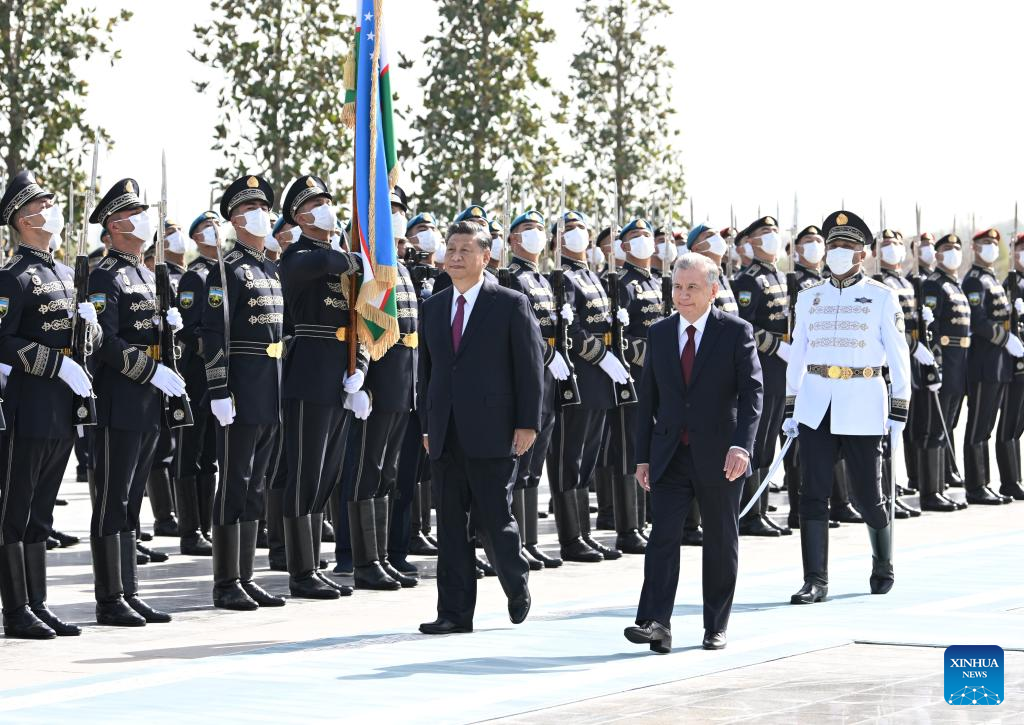 Chinese President Xi Jinping attends a grand welcome ceremony held by Uzbek President Shavkat Mirziyoyev in Samarkand, Uzbekistan, Sept. 15, 2022. Following the welcome ceremony, the two heads of state held official talks. (Xinhua/Shen Hong)