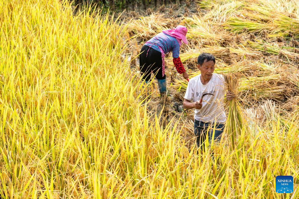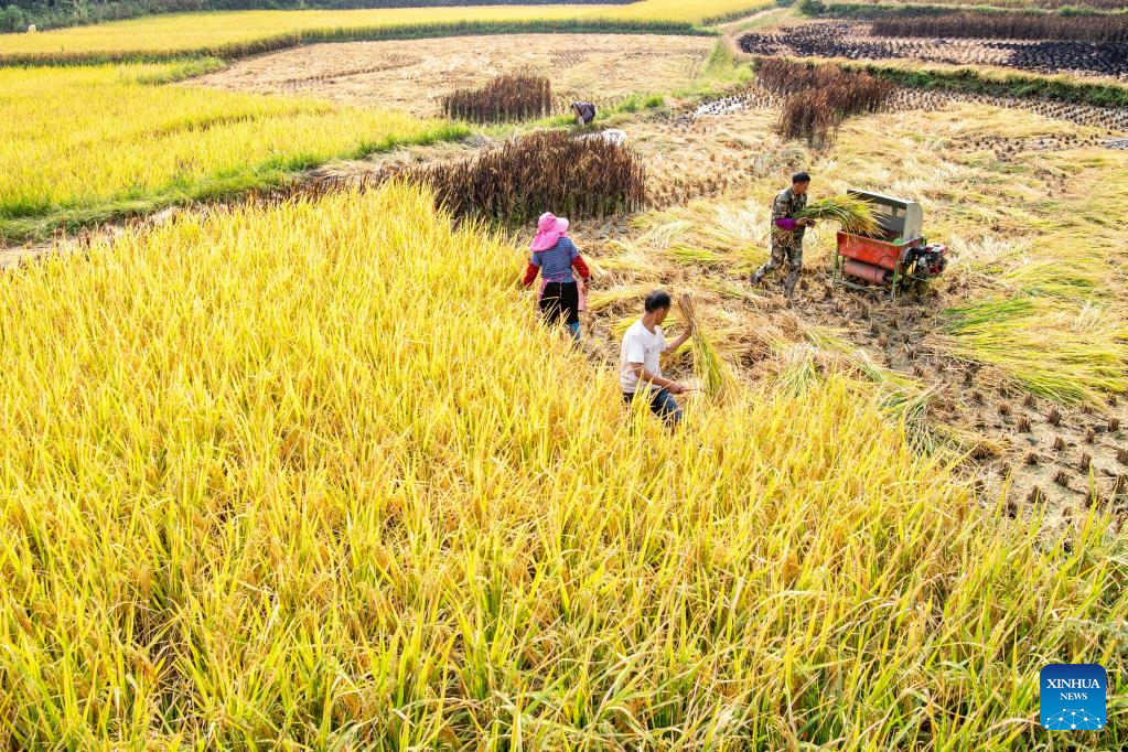 Farmers harvest rice at the paddy fields in Huatian Town of Youyang Tujia and Miao Autonomous County, southwest China's Chongqing, Sept. 14, 2022. Huatian Town of Youyang Tujia and Miao Autonomous County in Chongqing is famous for its rice production on terraced fields. (Xinhua/Tang Yi)