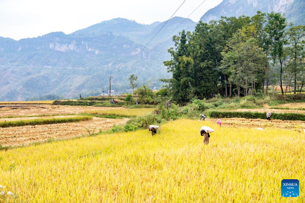 Farmers harvest rice at the paddy fields in Huatian Town of Youyang Tujia and Miao Autonomous County, southwest China's Chongqing, Sept. 15, 2022. Huatian Town of Youyang Tujia and Miao Autonomous County in Chongqing is famous for its rice production on terraced fields. (Xinhua/Tang Yi)