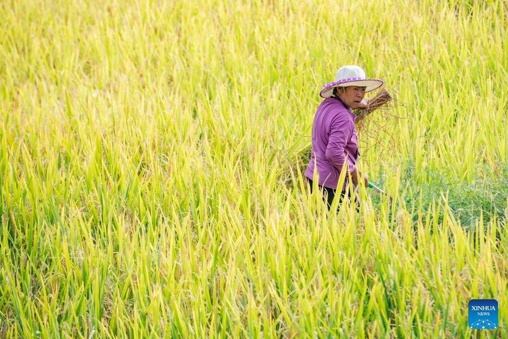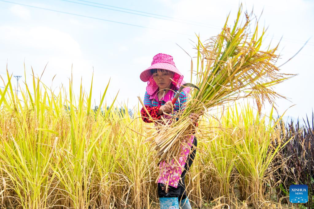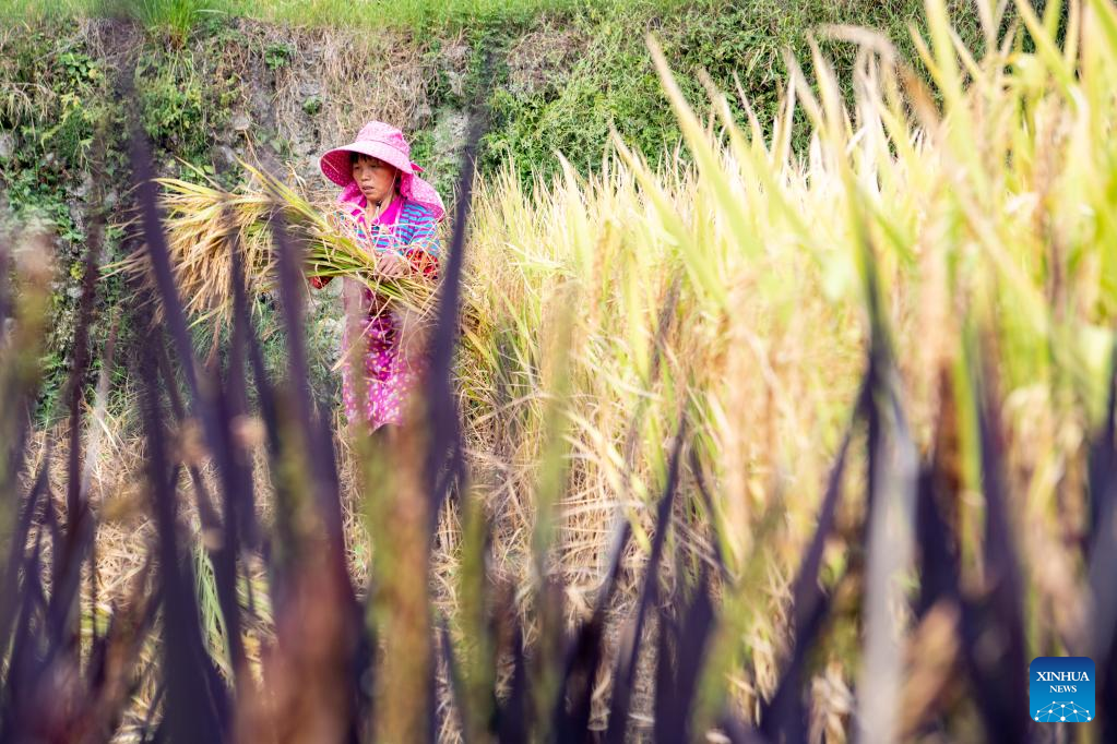 A villager harvests rice at the paddy fields in Huatian Town of Youyang Tujia and Miao Autonomous County, southwest China's Chongqing, Sept. 14, 2022. Huatian Town of Youyang Tujia and Miao Autonomous County in Chongqing is famous for its rice production on terraced fields. (Xinhua/Tang Yi)