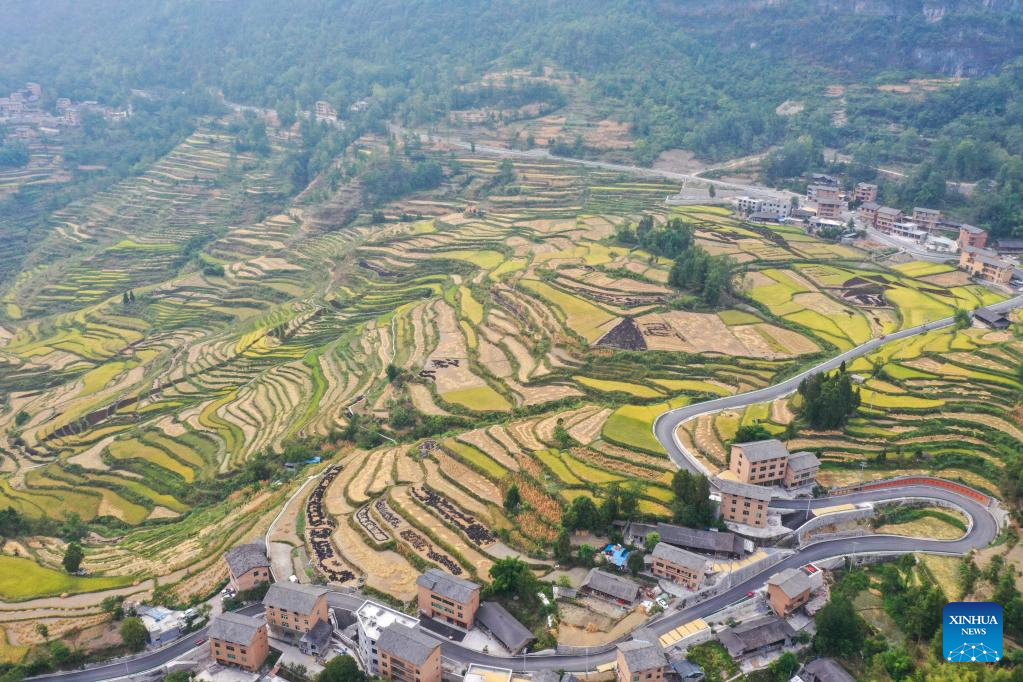 Aerial photo taken on Sept. 14, 2022 shows the terraced fields in Huatian Town of Youyang Tujia and Miao Autonomous County, southwest China's Chongqing. Huatian Town of Youyang Tujia and Miao Autonomous County in Chongqing is famous for its rice production on terraced fields. (Xinhua/Tang Yi)