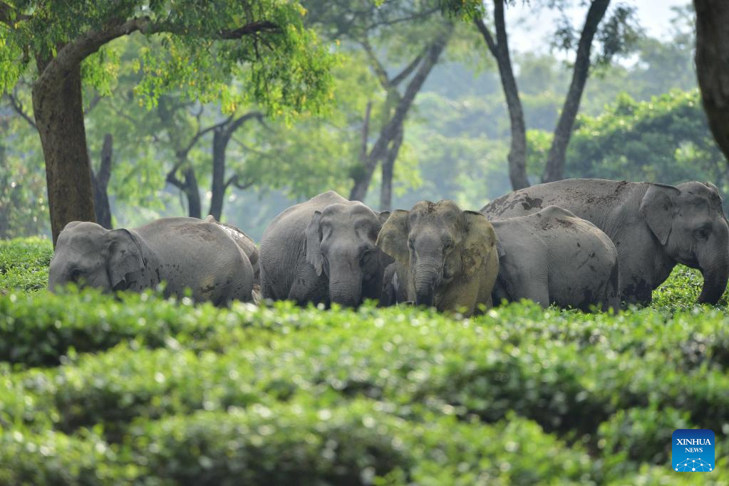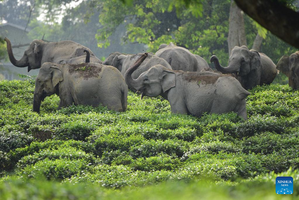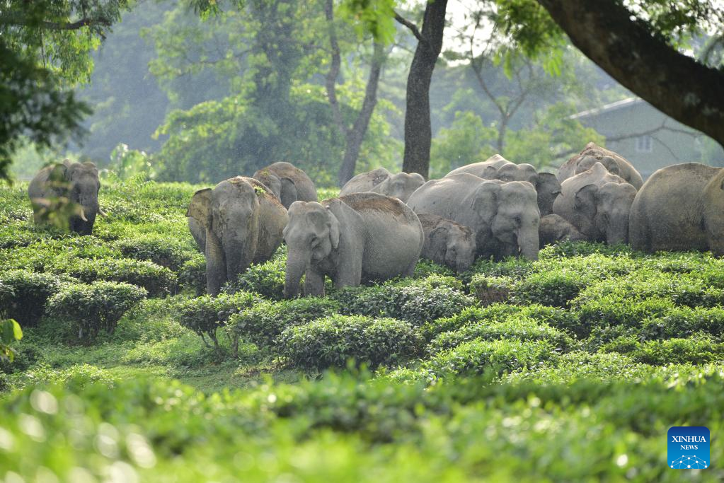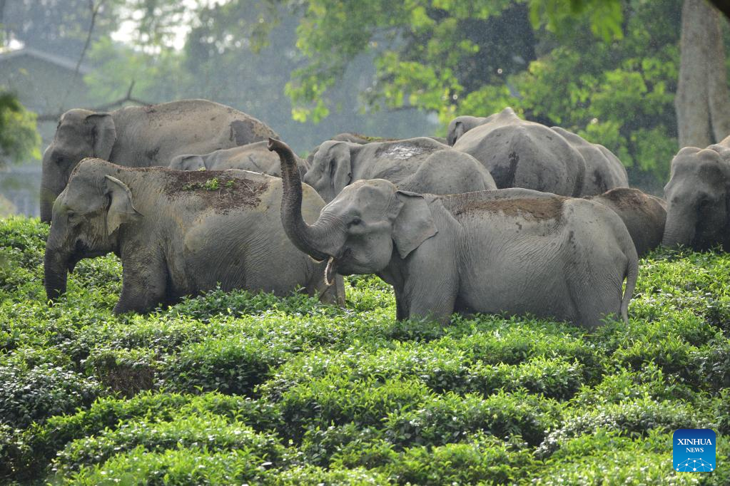 A herd of wild elephants are seen inside a tea estate in Nagaon district of northeastern state of Assam, India, Sept. 15, 2022. (Str/Xinhua)