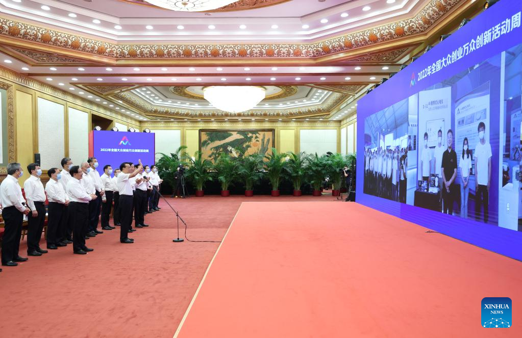 Chinese Premier Li Keqiang, also a member of the Standing Committee of the Political Bureau of the Communist Party of China Central Committee, communicates with representatives of entrepreneurs at the main venue in Hefei of east China's Anhui Province via video link during the launch ceremony for the mass entrepreneurship and innovation week at the Great Hall of the People in Beijing, capital of China, Sept. 15, 2022. Li addressed the launch ceremony for the mass entrepreneurship and innovation week in Beijing. He also announced the launch of the week. (Xinhua/Wang Ye)