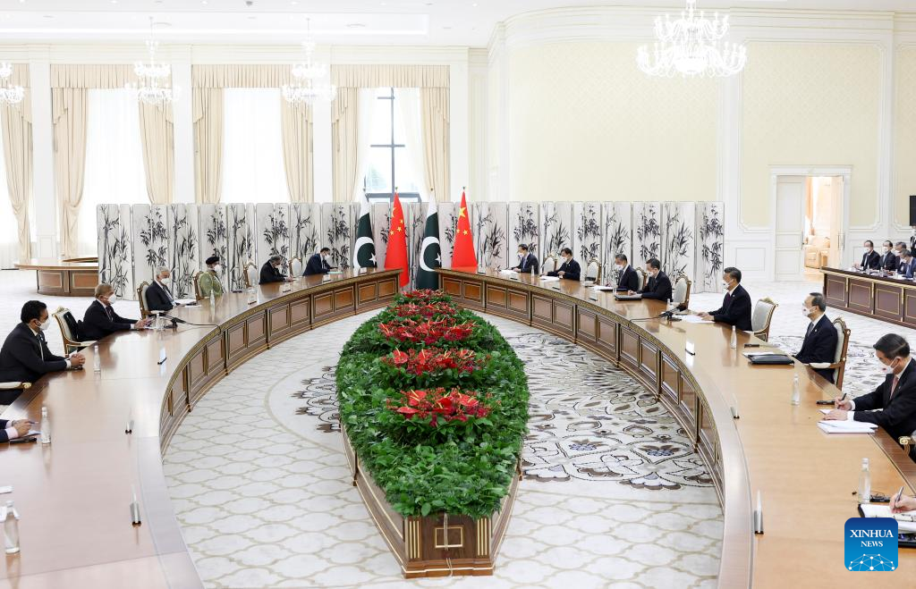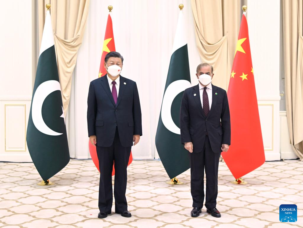 SAMARKAND, Uzbekistan, Sept. 16 (Xinhua) -- Chinese President Xi Jinping met with Pakistani Prime Minister Muhammad Shehbaz Sharif on Friday Morning at Forumlar Majmuasi Complex in Samarkand.