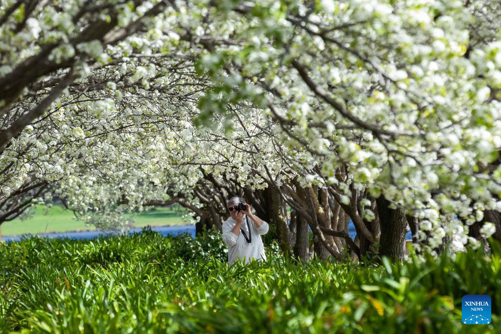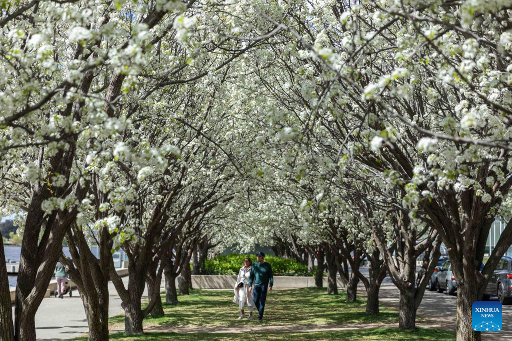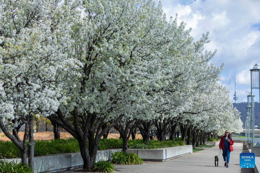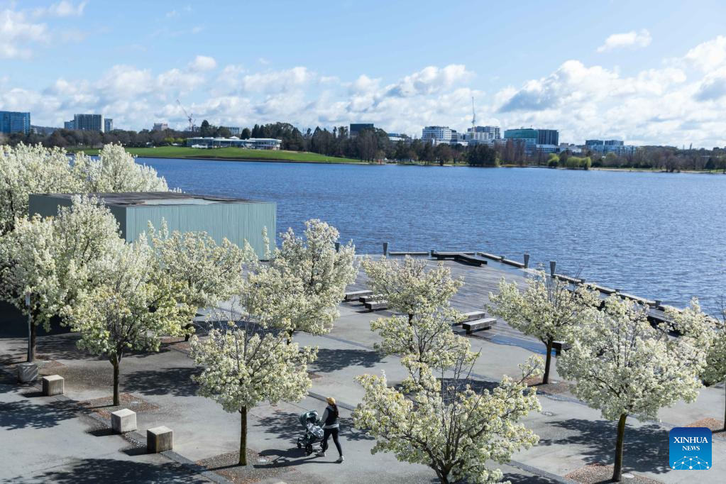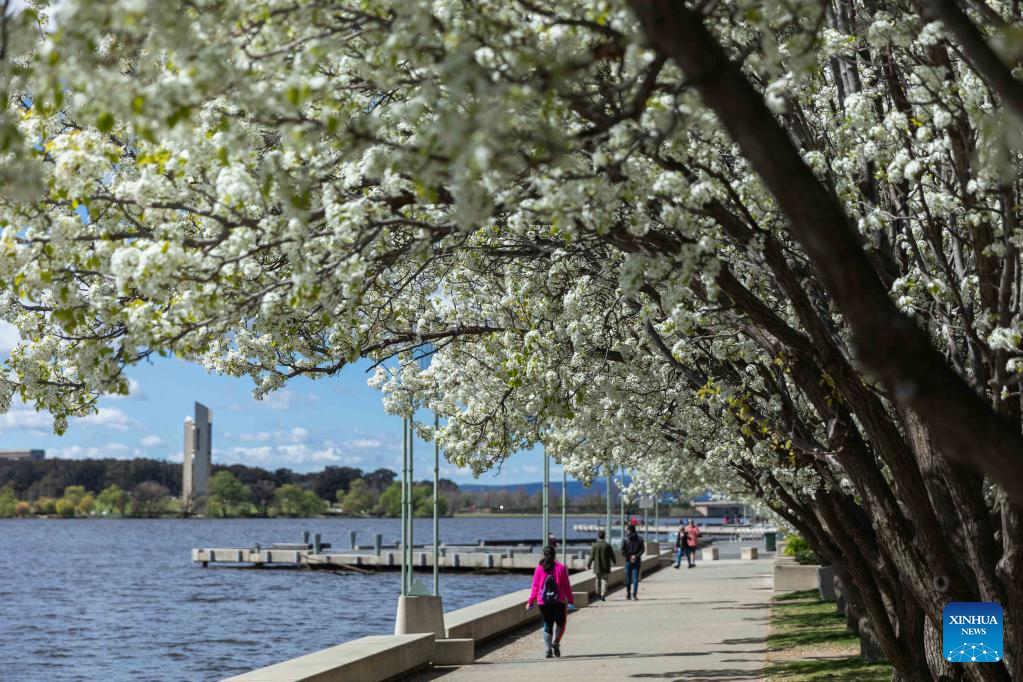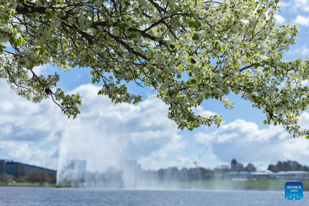 Photo taken on Sept. 16, 2022 shows blooming flowers in early spring by the Lake Burley Griffin in Canberra, Australia. (Photo by Chu Chen/Xinhua)