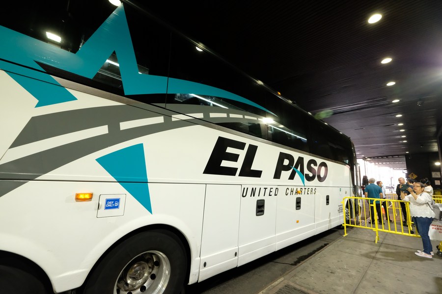 A migrant bus from Texas arrives at the Port Authority terminal in New York, the United States, on Aug. 29, 2022. (Photo by Emma Li/Xinhua)