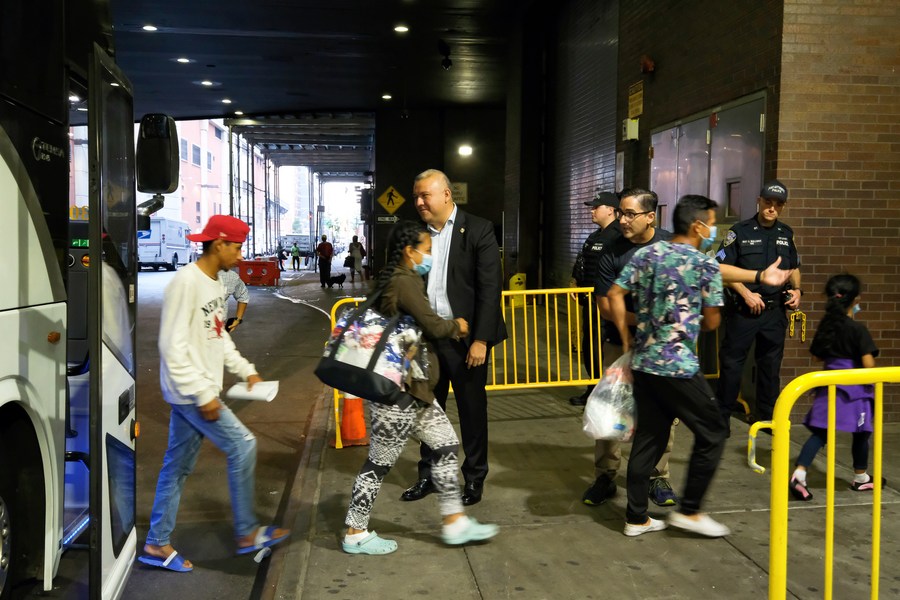 Migrants arrive at the Port Authority terminal in New York, the United States, on Aug. 29, 2022. (Photo by Emma Li/Xinhua)