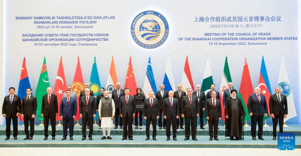 Chinese President Xi Jinping poses for a group photo with other leaders and guests ahead of the 22nd meeting of the Council of Heads of State of the Shanghai Cooperation Organization (SCO) in Samarkand, Uzbekistan, Sept. 16, 2022. Xi attended the meeting and delivered a speech. (Xinhua/Li Tao)