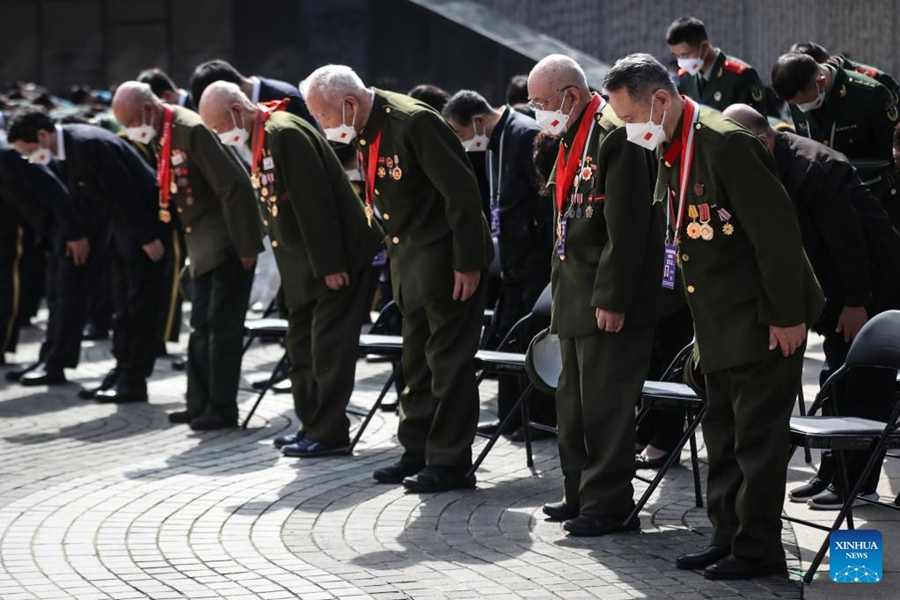 Chinese People's Volunteers (CPV) veterans pay tribute to martyrs of the CPV at the CPV martyrs' cemetery in Shenyang, northeast China's Liaoning Province, on Sept. 17, 2022. The remains of 88 Chinese soldiers killed in the War to Resist U.S. Aggression and Aid Korea returned to China on Friday from the Republic of Korea (ROK). This is the ninth such repatriation since 2014. (Xinhua/Pan Yulong)