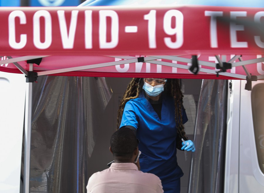 A medical worker collects a swab sample from a man at a COVID-19 testing site on Times Square in New York, the United States, May 17, 2022. (Xinhua/Wang Ying)