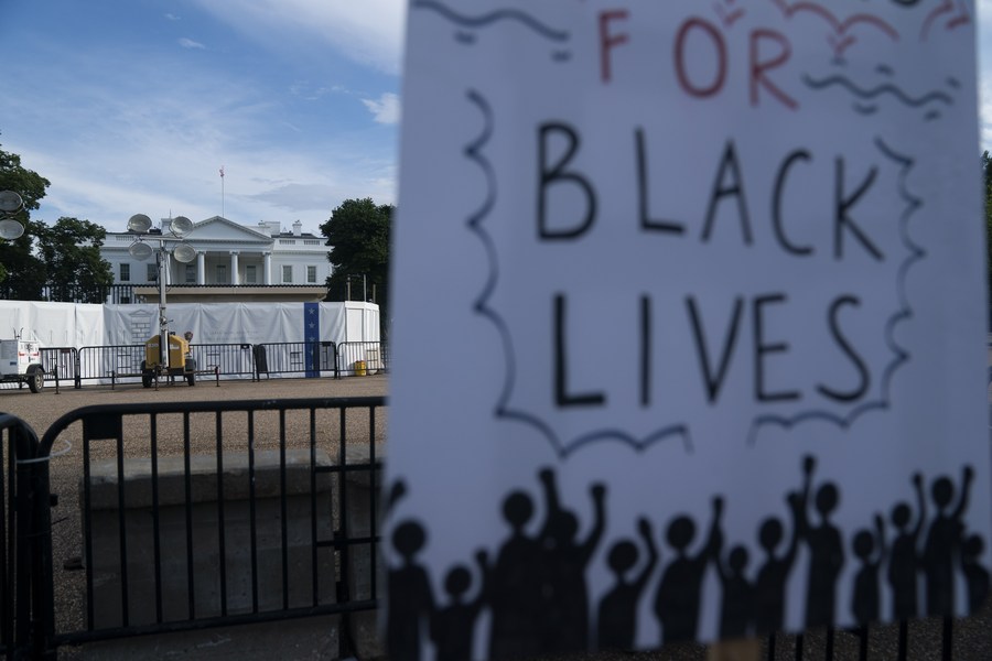 A sign is seen during protests against racial injustice to mark Juneteenth, commemorating the end of slavery in the United States, near the White House in Washington, D.C., the United States, June 19, 2020. (Xinhua/Liu Jie)