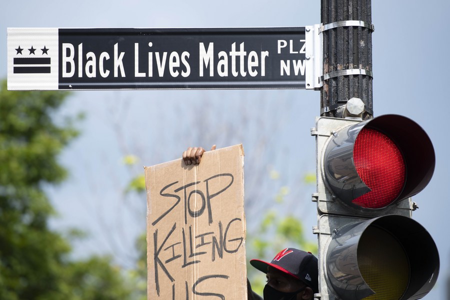 A protester is seen under the sign "Black Lives Matter Plaza" near the White House during a demonstration over the death of George Floyd in Washington D.C., the United States, on June 6, 2020. (Xinhua/Liu Jie)