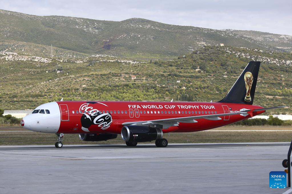 The airplane carried the FIFA World Cup Trophy arrives in Split, Croatia on Sept. 17, 2022. FIFA World Cup Trophy Tour arrives in Split, Croatia on Saturday and is on display to the public during the weekend. (Photo by Miroslav Lelas/PIXSELL via Xinhua)