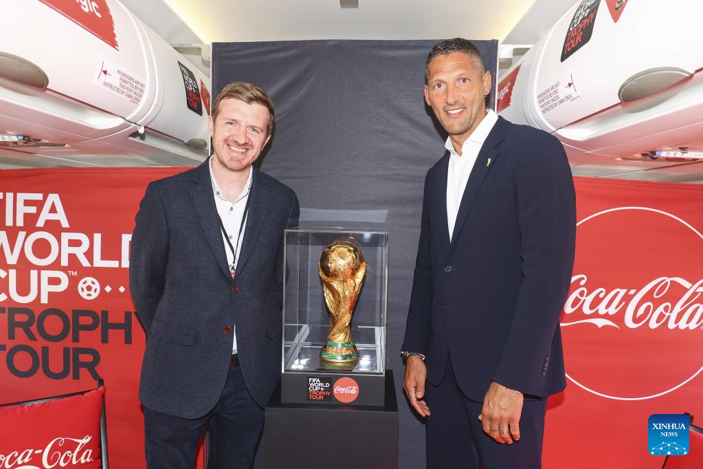Former Italian football player Marco Materazzi (R) and event organizer Mark Docherty poses with the trophy during the FIFA World Cup Trophy Tour event in Split, Croatia, on Sept. 17, 2022. FIFA World Cup Trophy Tour arrives in Split, Croatia on Saturday and is on display to the public during the weekend. (Photo by Miroslav Lelas/PIXSELL via Xinhua)