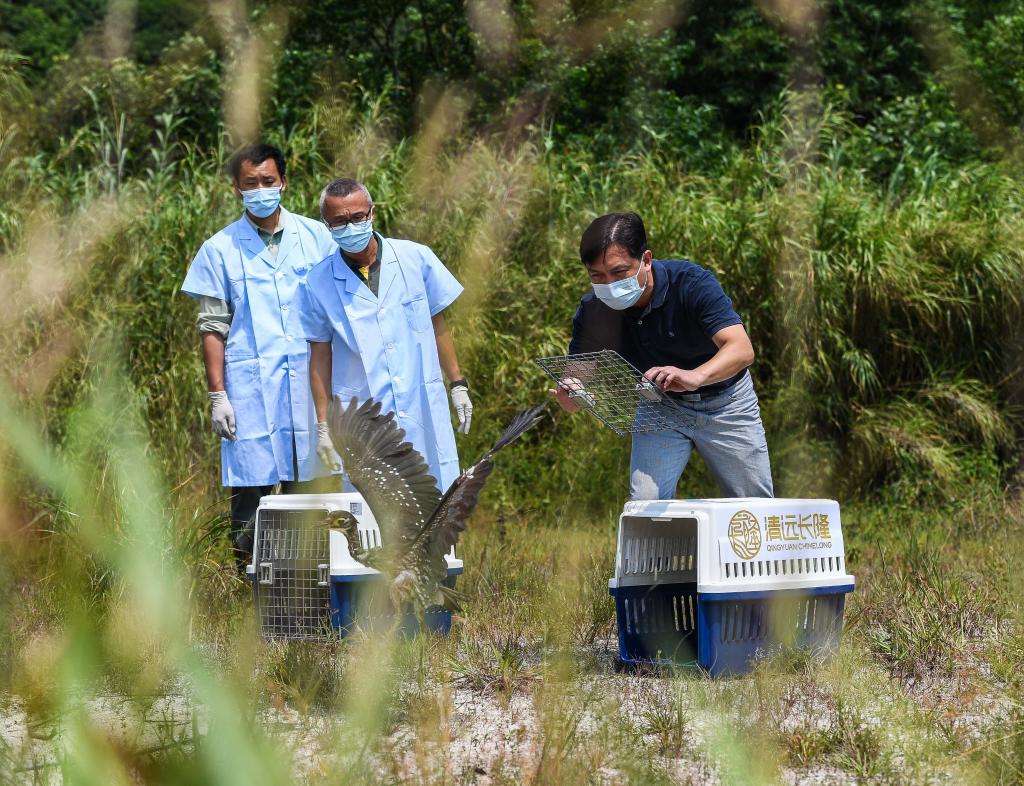 Staff members release a white-eared night heron in Qingyuan City, south China's Guangdong Province, Sept. 16, 2022. (Xinhua/Liu Dawei)