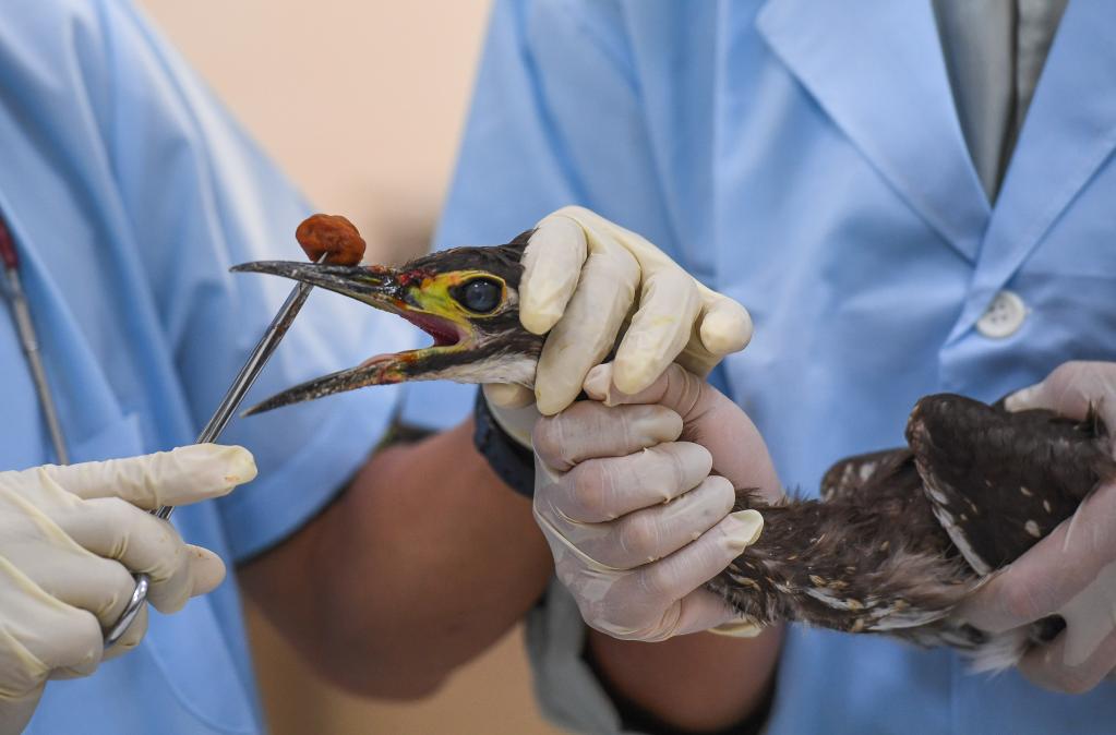 A white-eared night heron receives a medical check before being released at a wild animal care center in Qingyuan City, south China's Guangdong Province, Sept. 16, 2022. (Xinhua/Liu Dawei)