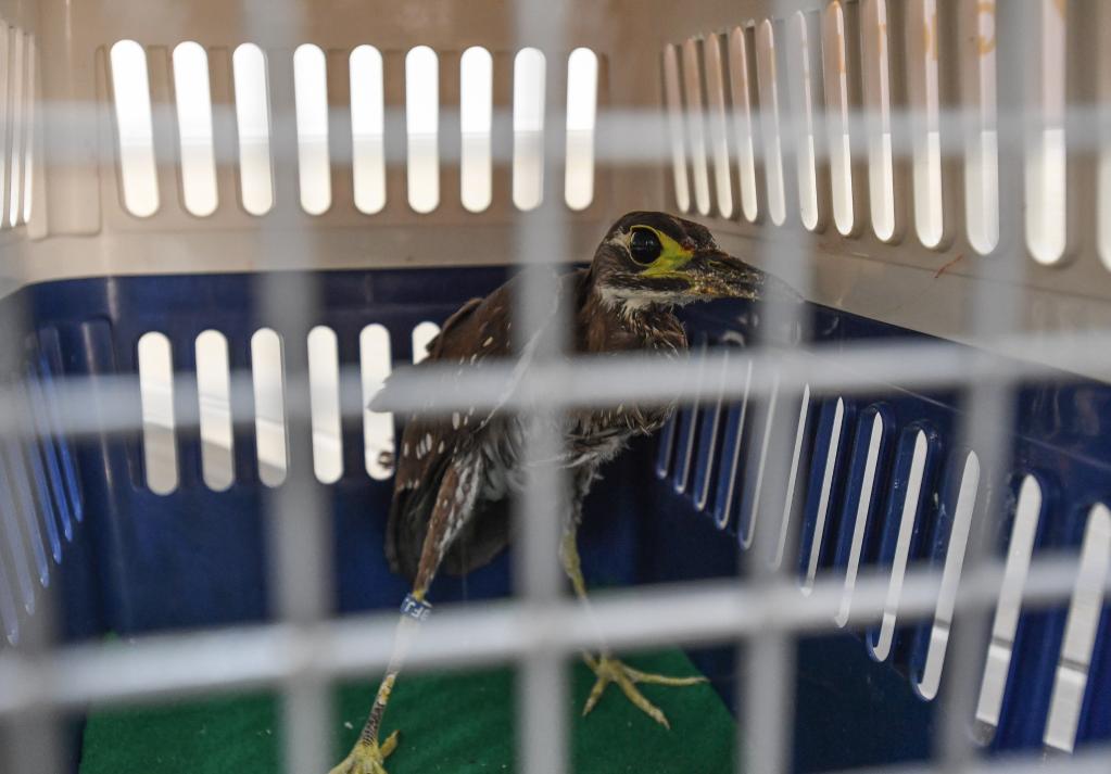 A white-eared night heron waits to be released at a wild animal care center in Qingyuan City, south China's Guangdong Province, Sept. 16, 2022. (Xinhua/Liu Dawei)