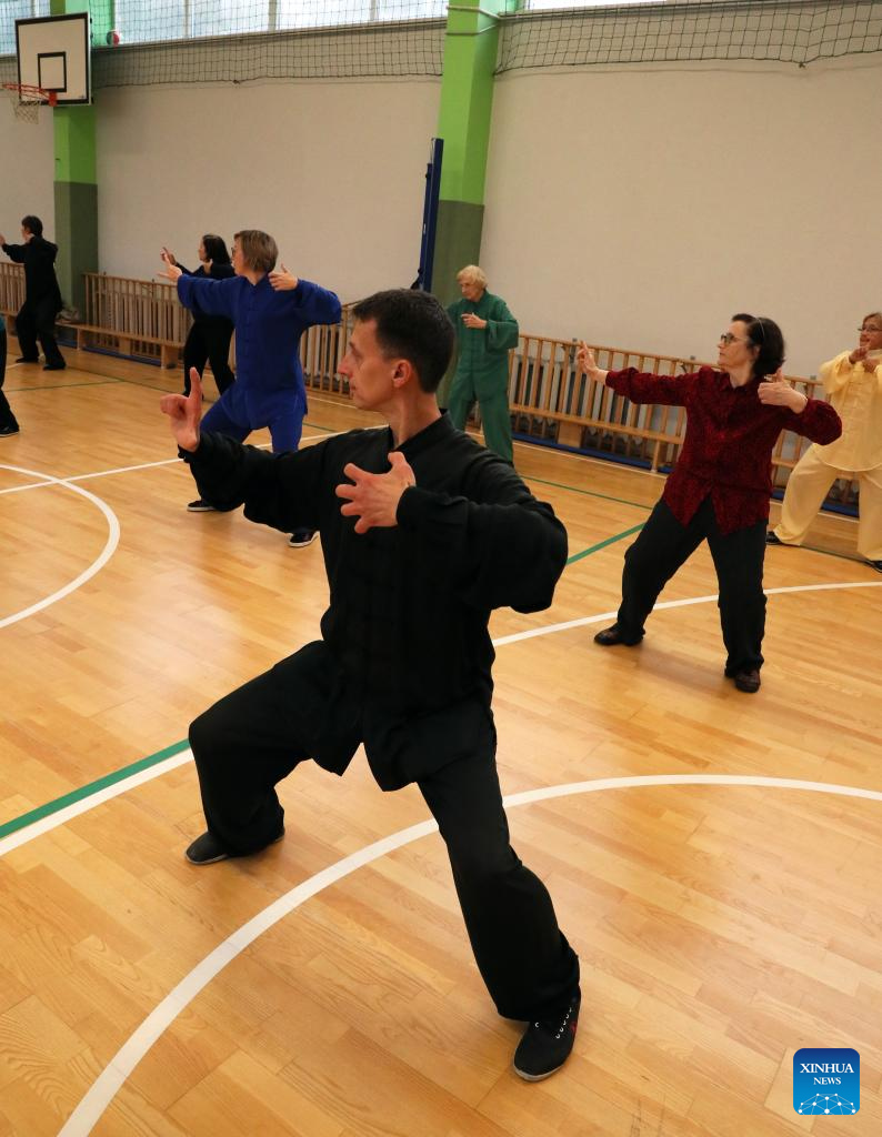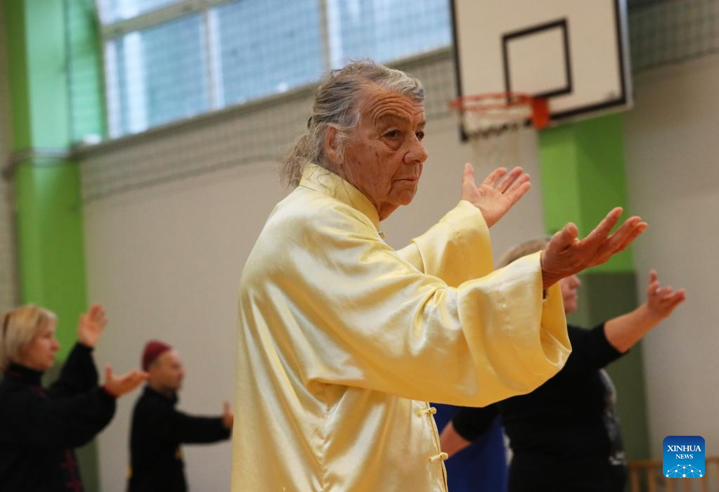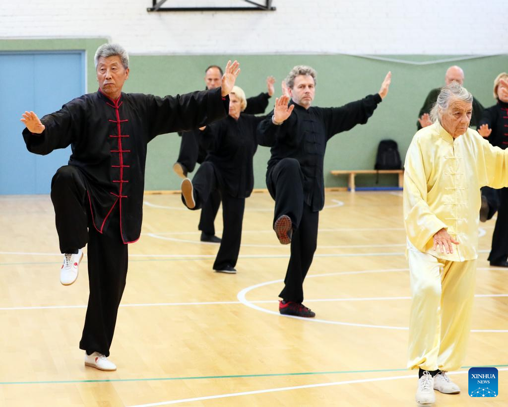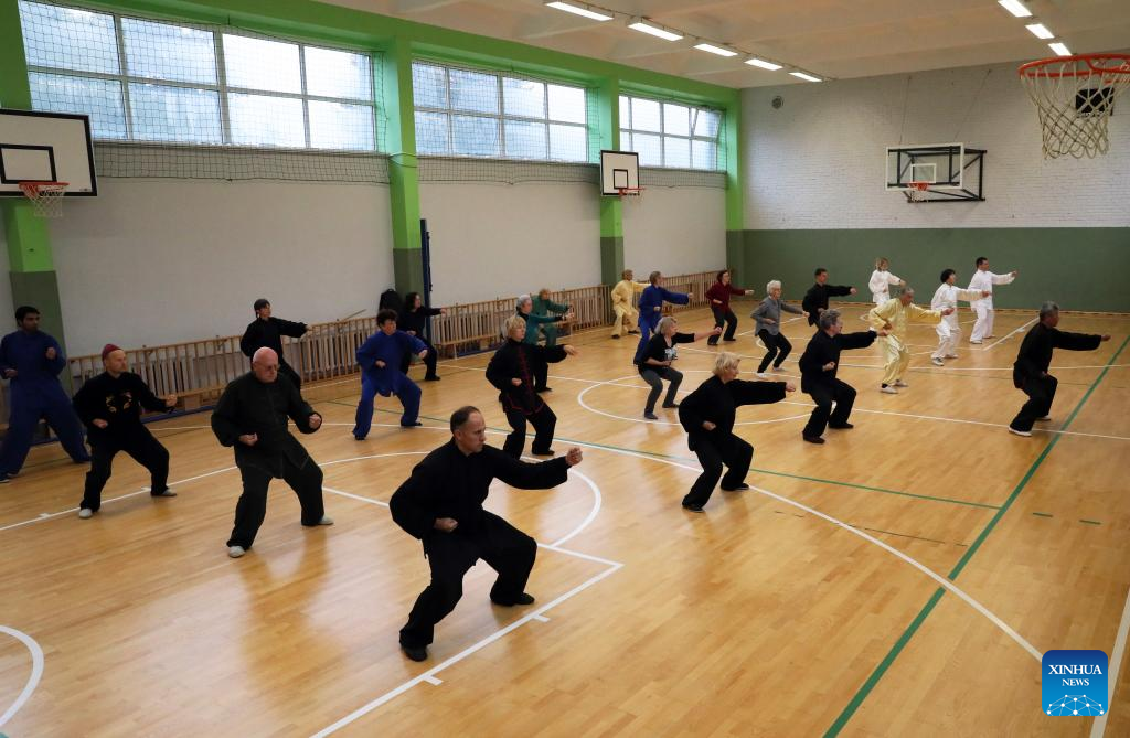 Chinese Tai Chi enthusiasts practice with coach Wang Xiyin (1st L) in Vilnius, Lithuania, Sept. 18, 2022. Dozens of Tai Chi enthusiasts gathered in Vilnius on weekend to practice Tai Chi under the guidance of coach Wang Xiyin, who has been living in Lithuania for more than 30 years and is the Tai Chi coach in the past 20 years. (Photo by Yang Weihua/Xinhua)
