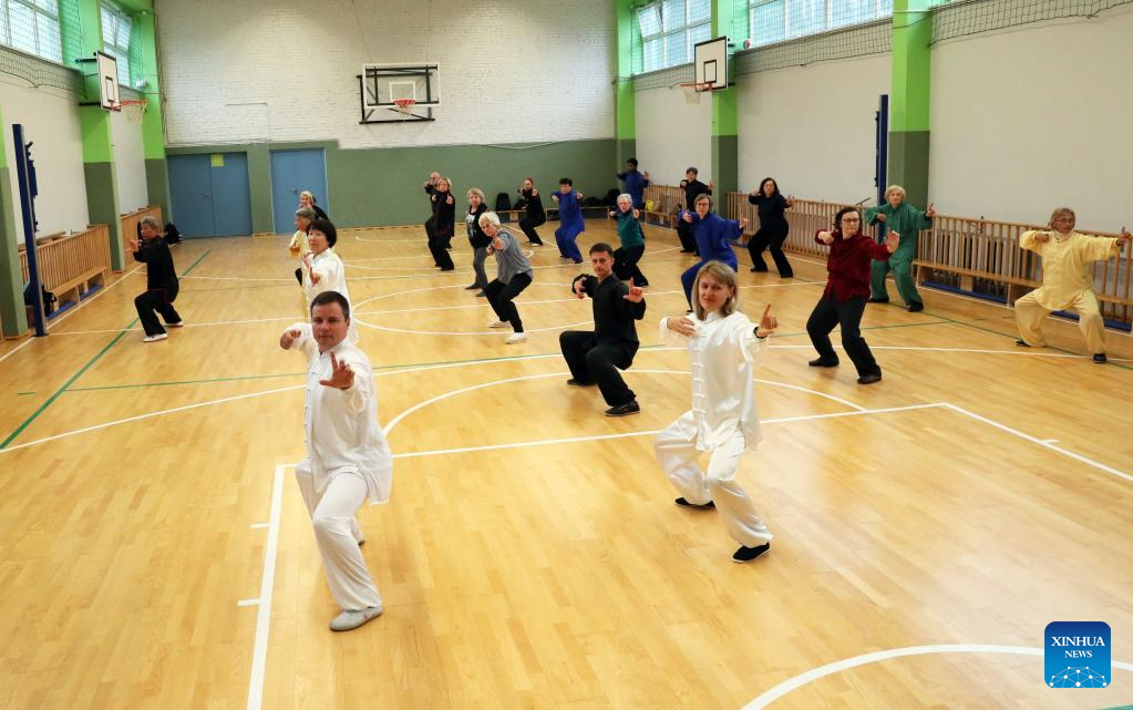 People practice Chinese Tai Chi in Vilnius, Lithuania, Sept. 18, 2022. Dozens of Tai Chi enthusiasts gathered in Vilnius on weekend to practice Tai Chi under the guidance of coach Wang Xiyin, who has been living in Lithuania for more than 30 years and is the Tai Chi coach in the past 20 years. (Photo by Yang Weihua/Xinhua)