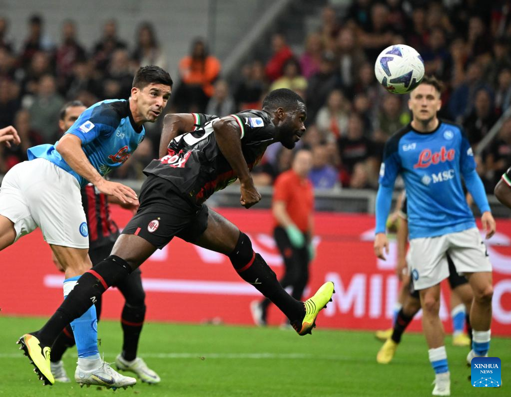 AC Milan's Davide Calabria (L) vies with Napoli's Khvicha Kvaratskhelia during a Serie A football match between AC Milan and Napoli in Milan, Italy, on Sept. 18, 2022. (Photo by Alberto Lingria/Xinhua)