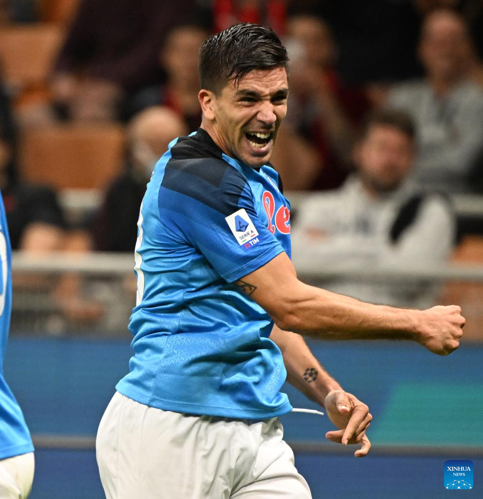 Napoli's Matteo Politano (R) celebrates scoring during a Serie A football match between AC Milan and Napoli in Milan, Italy, on Sept. 18, 2022. (Photo by Alberto Lingria/Xinhua)