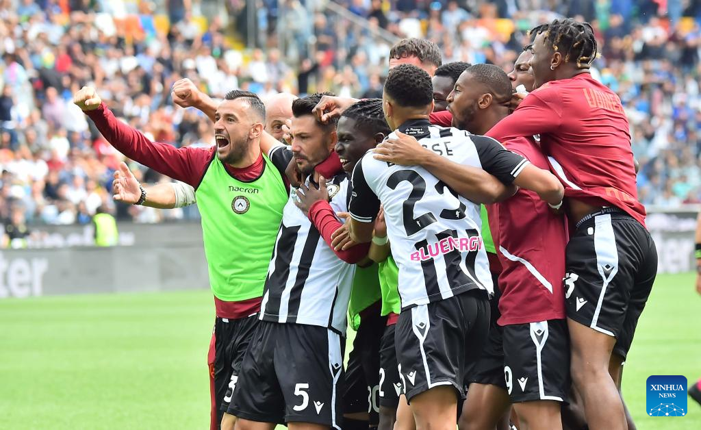 Udinese's Tolgay Arslan (L) celebrates scoring during a Serie A soccer match between Udinese and FC Inter in Udine, Italy, on Sept. 18, 2022. (Str/Xinhua)